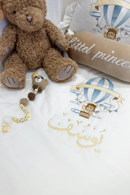 סט מצעים יוקרתי – בעיצוב אישי עם רקמת דובי ומטוס