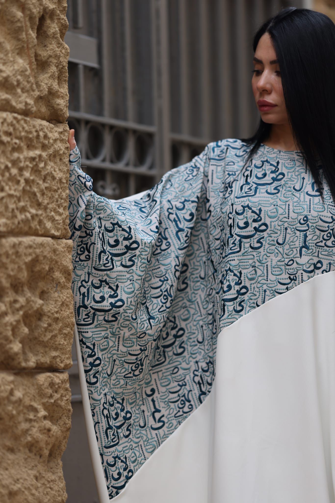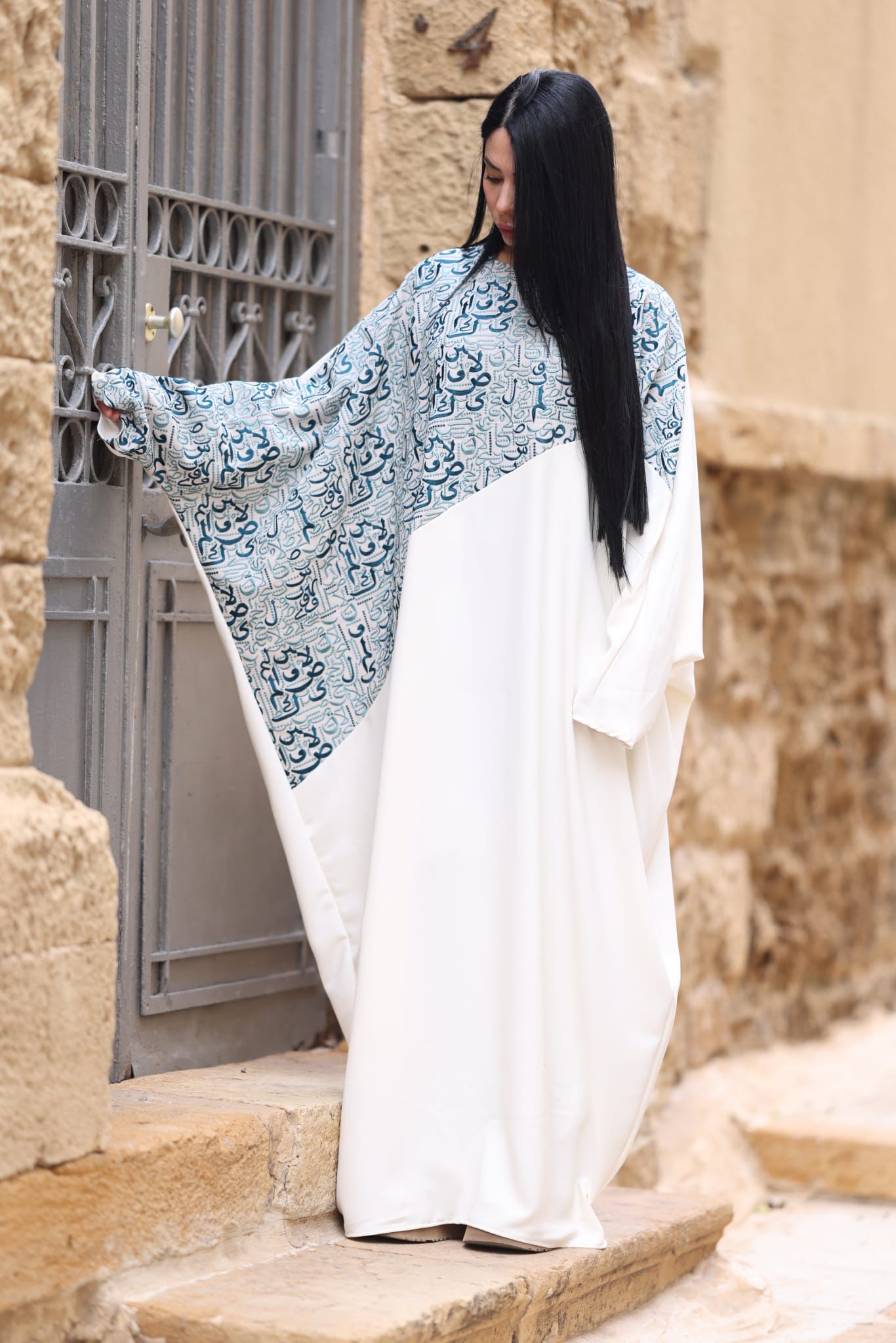 عباية بلون ابيض بتطريز تركواز أنيق—مثالية لرمضان وجلسات تصوير رمضانية