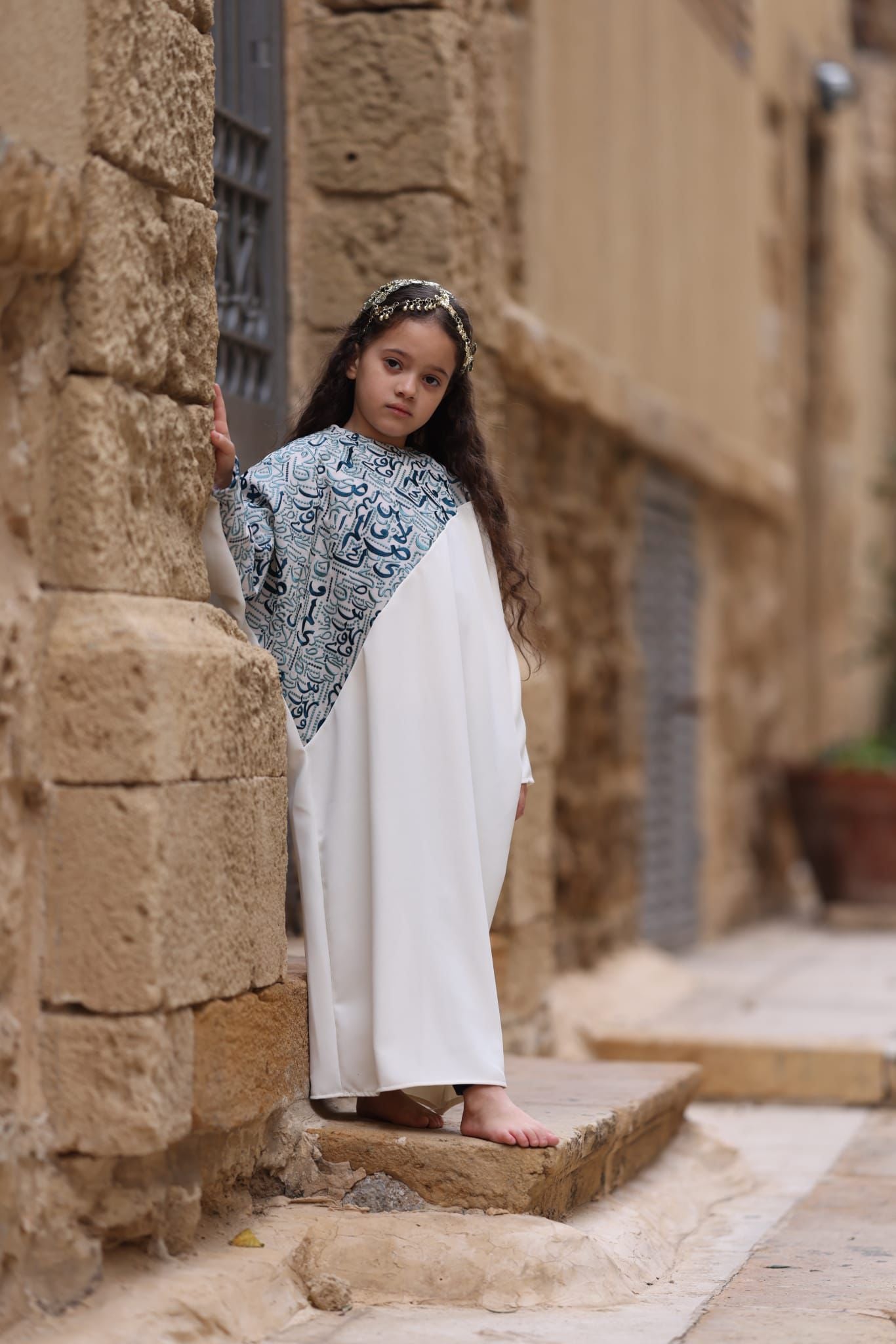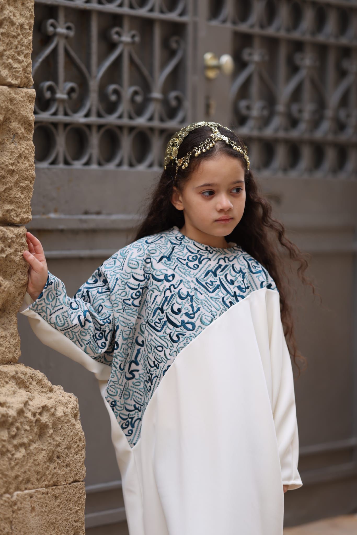 عباية لون ابيض بتطريز تركواز أنيق — مثالية لرمضان وجلسات تصوير رمضانية